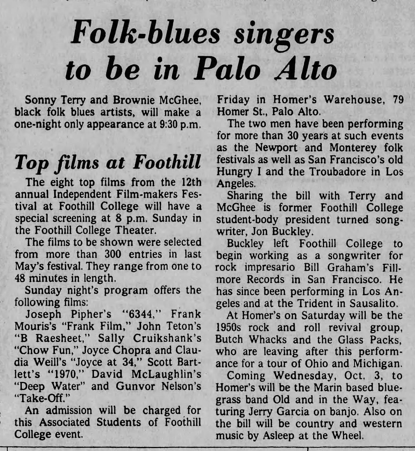 Acoustic Show: On And On , Catfish John , Going To The Races , Lonesome Fiddle Blues , Land Of The Navajo , Eating Out Of Your Hand , Uncle Pen , Hobo Song , Pig In A Pen , Sally Goodin [1] , Panama Red , Lonesome L.A. Cowboy , Wicked Path Of Sin , Blue Mule , I'm On My Way Back To The Old Home [2] , Old And In The Way , Old And In The Way Breakdown , Mule Skinner Blues [2] , You'll Find Her Name Written There [3] , Till The End Of The World Rolls Round , Down Where The River Bends , Lost , Drifting Too Far From The Shore , Love Please Come Home , That High Lonesome Sound , Wild Horses , White Dove , Midnight Moonlight , Orange Blossom Special [1] Only known performance (by OAITW) and final time played by any act last known performance on 1963-05-12 by Wildwood Boys [2] Final known performance [3] First known performance