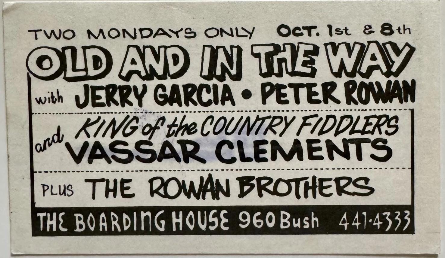 Complete Release Old and In the Way: 10/8/73 The Boarding House San Francisco Live At The Boarding House: The Complete Shows Acoustic Set 1: Home Is Where The Heart Is [1] , Love Please Come Home [1] , Down Where The River Bends [2] , Kissimee Kid [1] , Pig In A Pen , Uncle Pen , Panama Red , Midnight Moonlight , White Dove , Wild Horses , Orange Blossom Special , Old And In The Way [1] , Lonesome Fiddle Blues Acoustic Set 2: On And On [1] , Land Of The Navajo , Catfish John , Till The End Of The World Rolls Round [1] , Drifting Too Far From The Shore , Knockin' On Your Door , Old And In The Way Breakdown , You'll Find Her Name Written There [1] , Jerry's Breakdown (1973) [1] , The Great Pretender [1] , Working On A Building [1] , That High Lonesome Sound , Wicked Path Of Sin , Blue Mule [1] [1] Final known performance [2] Final known performance (by OAITW) next performance on 1992-05-08 by JGDG