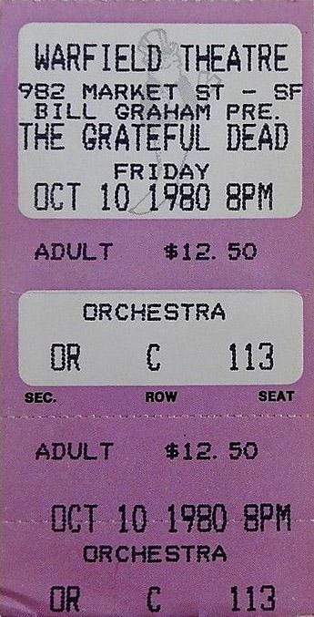Acoustic Set: On The Road Again [1] , It Must Have Been The Roses [1] , Monkey And The Engineer [1] , Jack-A-Roe [1][2][3] , Dark Hollow [1] , To Lay Me Down [1] , Heaven Help The Fool [1] , Bird Song [1] > Ripple [1] Electric Set 1: Mississippi Half Step > Franklin's Tower , Me And My Uncle > Big River , Candyman , Beat It On Down The Line , Row Jimmy [3][4] , Minglewood Blues [4] , Althea , Jack Straw [4] Electric Set 2: Scarlet Begonias > Fire On The Mountain , Samson And Delilah [4] , Big Railroad Blues , Estimated Prophet [5] > Eyes Of The World > Drums > Space [6] > Truckin' > Nobody's Fault But Mine [7][8] > Black Peter > Around And Around > Promised Land Electric Encore: U.S. Blues [1] Released on The Warfield: October 9, 1980 & October 10 [2] Released on Reckoning [3] Released on Beyond Description (1973 - 1989) [4] Released on Dead Set [5] Released on Beyond Description (1973 - 1989) Bonus Disc [6] with Drummers [7] Last known performance (by GD) 1979-09-02 (95 events ago) [8] Theme only