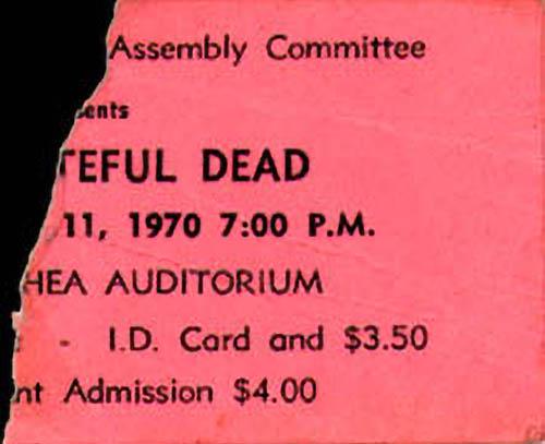 the second show opened with China Cat. So we assign that part of the tape to the late show. "The college did not book the band until a week before the gig. The college did not tell the band that to pay them what they wanted they would have to play to two shows in one night because the theater only had a few hundred seats. The tickets were $3 and $4. There was supposed to be 6:00 and 9:00 shows. The band was all there by 5:30 except for Lesh who was lost in a taxi riding around Paterson for hours because the taxi driver did not know Paterson State is not in Paterson. Needless to say Lesh showed up at 8:30 and we had a 9:00 and a 10:30 show. there was a midnight curfew. The second show opened with China Cat.