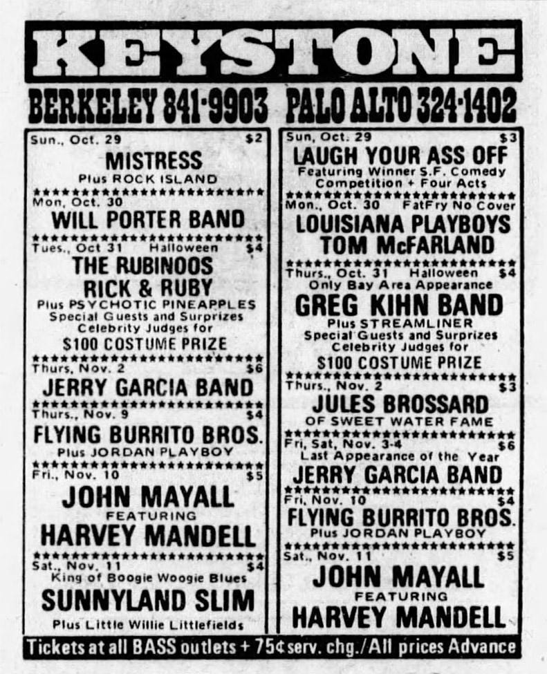 Final show of the Keith and Donna era of JGB. Color: secondhand recollections posted at hooterollin' have Jerry and John getting out of the car and claiming to have seen a UFO on the Junipero Serra Freeway on the drive, and Jerry offering up bumps of coke to a new friend on a switchblade.