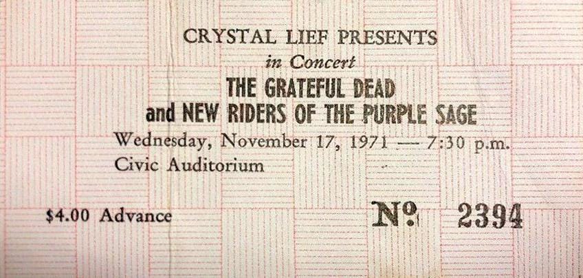 - exante: "Sold Out," New Mexico Lobo, November 17, 1971, p. 1; . "Sold Out" item reads: If you want to see the Grateful Dead and the New Riders of the Purple Sage at the Civic Auditorium tonight, you better already have your ticket in band because it's sold out. The time has been moved up to 7 p.m. because the Dead and the Riders have this habit of playing for a long, long time."