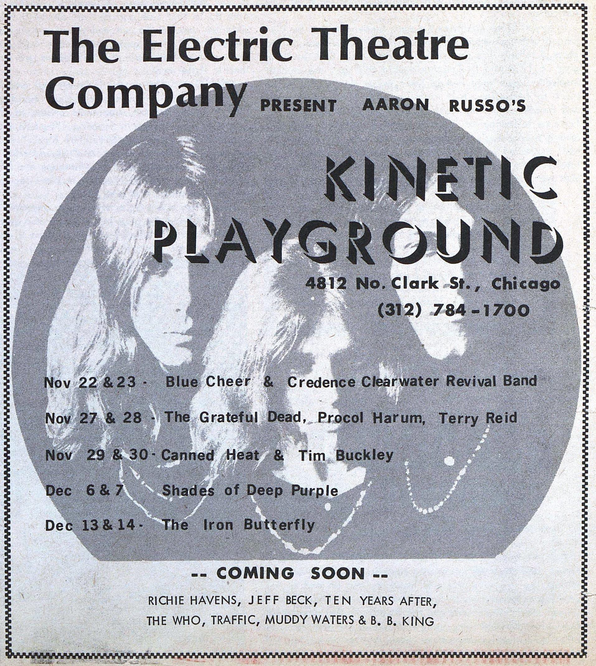 - review: [positive] Robb Baker, "The Sound," Chicago Tribune, December 2, 1968, p. C11. He absolutely raves about the whole show, which ran as a single 2 1/2 hour set. This review supplies the Feedback > AWBYG that we list
