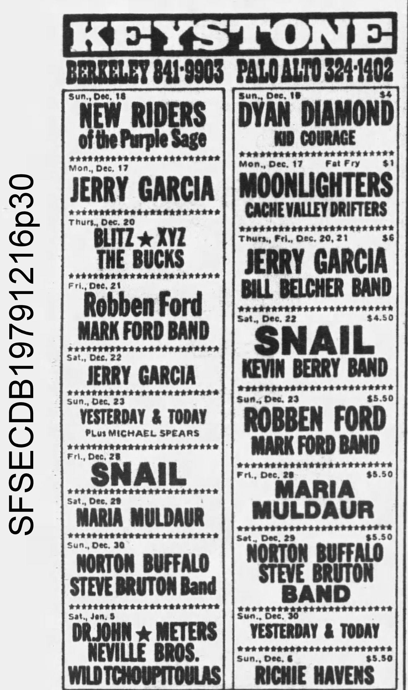 Set 1: It Ain't No Use , Catfish John , Crazy Arms [1] , Tough Mama , Guilty [2] , Pig's Boogie , (I'm A) Road Runner Set 2: Mission In The Rain , That's What Love Will Make You Do , Friend Of The Devil , I'll Take A Melody [3] , Mystery Train , How Sweet It Is (To Be Loved By You) [1] Final known performance [2] Only known performance [3] Jingle Bells noodling before, minor Garcia participation