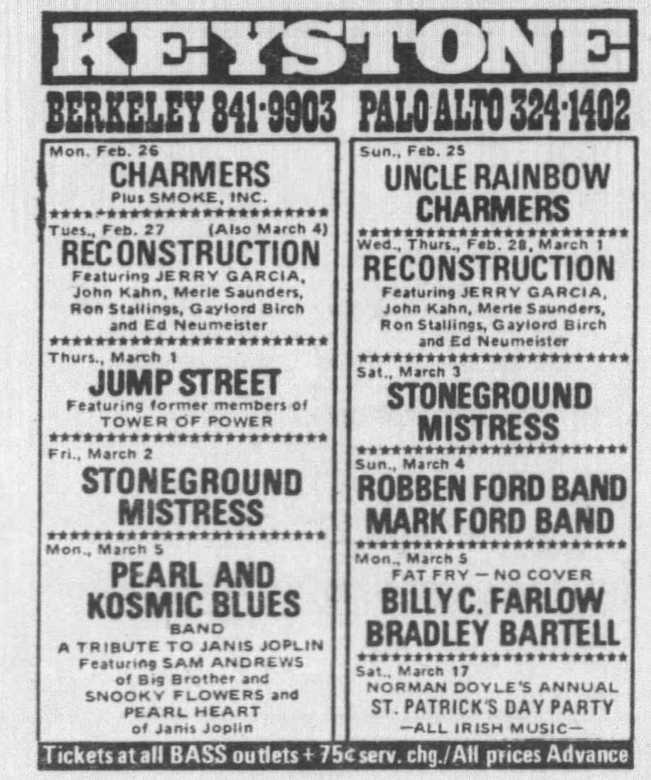 Musicians Jerry Garcia - electric guitar, vocals Ed Neumeister - trombone Gaylord Birch - drums, vocals John Kahn - electric bass Merl Saunders - keyboards, synthesizers, vocals Ron Stallings - saxophone, vocals
