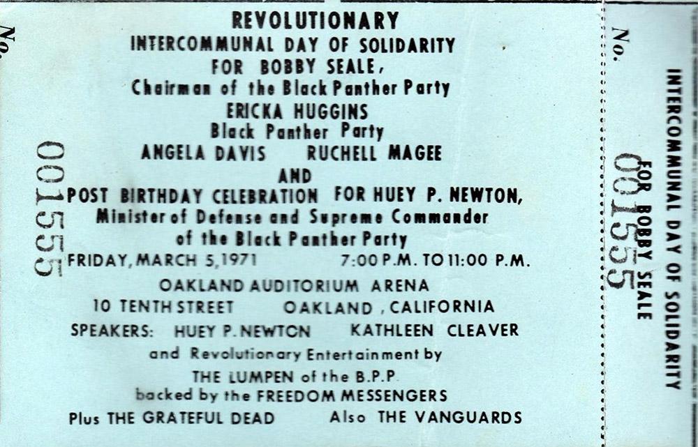 "I was at the Black Panther show. Bobby was right in front of me entering the front doors and he got frisked for weapons like everyone else. He fell over while they were frisking him and they caught him and propped him back up. It was weird to hear these Panther speeches followed by the Dead's set (one set, not very long as I remember). When the Dead came on the white hippies in attendance moved towards the front dancing. It didn't strike me as one of the better shows I saw in 71 but was fun. Ken Kesey was on stage and a couple of the Pranksters were moving through the audience with eyedroppers of LSD. Stick out your tongue and a Prankster would put a drop of LSD onto it."