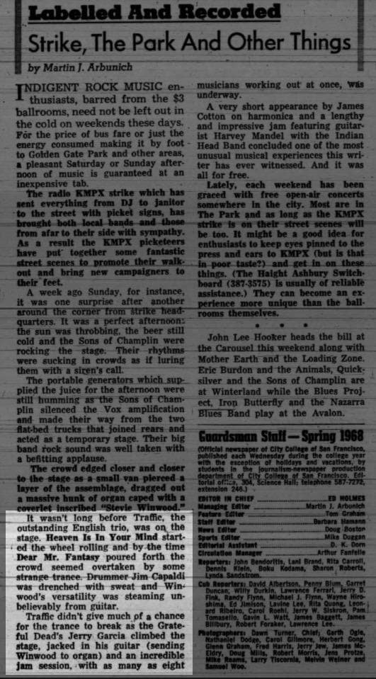 Garcia's appearance with Traffic was originally thought to have occurred on 3/18, but is now confirmed, via Arbunich 1968 (brought to light by commenter Steven Johnson at LLD), to have been 3/24. Arbunich's account supplies the following details: Sons of Champlin played first, then Traffic (the trio) did "Heaven Is In Your Mind", maybe some other tunes, and "Dear Mr. Fantasy". Garcia came onstage, plugged into Winwood's guitar amp, Stevie jumped to the organ, and a jam session ensued with up to eight players onstage at one time