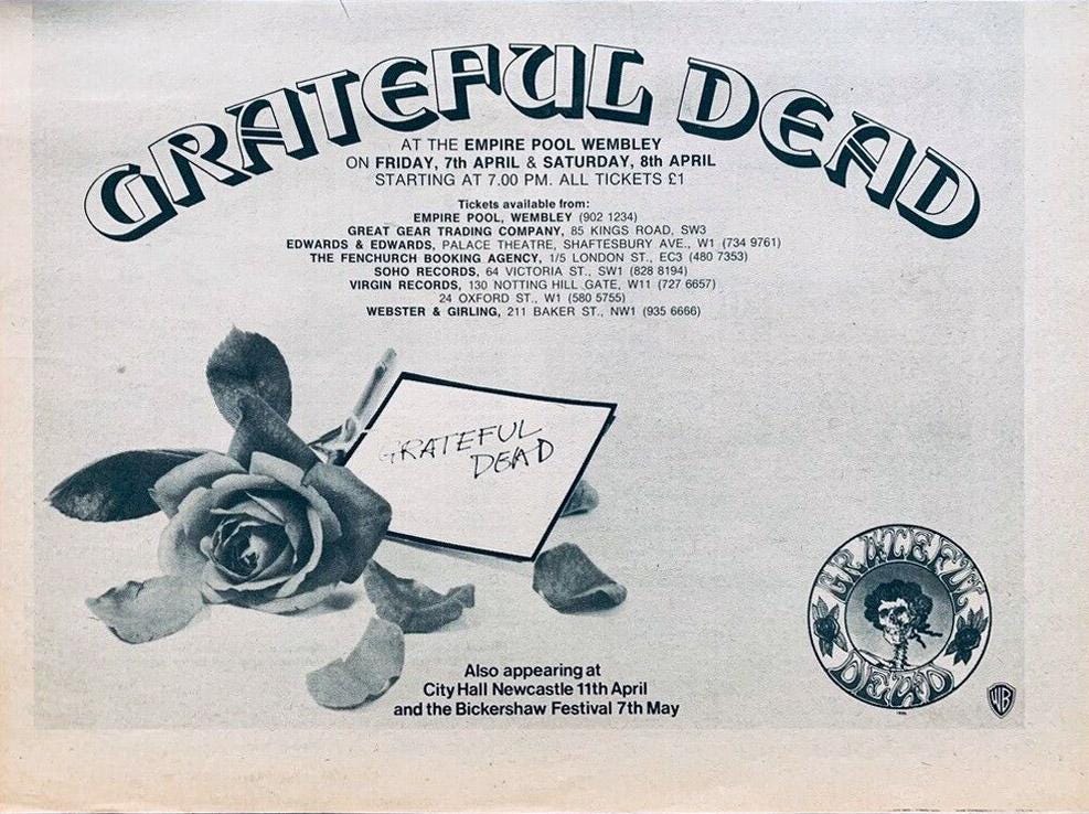 Released As Europe '72: The Complete Recordings Wembley Empire Pool, London, England 4/8/72 Set 1 Bertha , Me And My Uncle , Mr. Charlie , Deal , Black Throated Wind [1] , Next Time You See Me , Cumberland Blues [2][3] , Brown Eyed Women [4] , Beat It On Down The Line , Tennessee Jed , Playing In The Band , Good Lovin' , Looks Like Rain [3][5] , Casey Jones Set 2 Truckin' , Big Railroad Blues [1] , Hurts Me Too [1] , Dark Star [1] > Mind Left Body Jam [1] > Sugar Magnolia [1] > Caution [1] Encore One More Saturday Night [1]